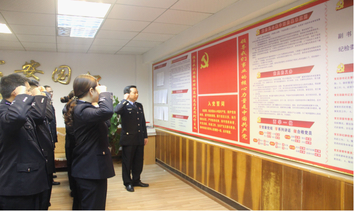在市局机关八楼国保支队党员活动室内,气氛热烈,场面庄重,16名党员胸前佩戴党徽,映衬着墙上的党旗格外鲜艳。在秦东书记的领誓下,全体党员高举右拳,庄严宣誓“我志愿加入中国共产党,拥护党的纲领……”。八十字的誓词,字字千钧、句句铭心;十六名党员的誓言,铮铮嘹亮、拳拳赤诚。